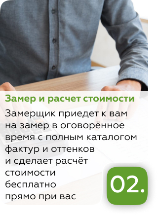 Замерщик приедет к вам на замер в оговорённое время с полным каталогом фактур и оттенков и сделает расчёт стоимости бесплатно прямо при вас