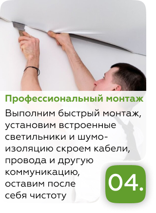 Выполним быстрый монтаж, установим встроенные светильники и шумоизоляцию, скроем кабели, провода и другую коммуникацию, оставим после себя чистоту