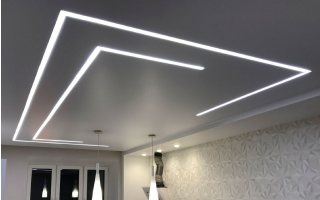 Современное дизайнерское решение в освещении натяжных потолков в виде острова